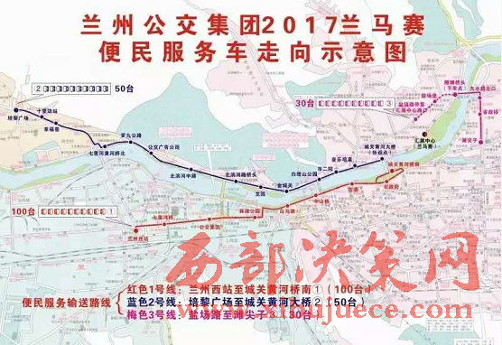 2號(hào)接送專線:賽事當(dāng)天早4:40時(shí)開(kāi)始至6:30結(jié)束(路橋封閉之前),由培黎廣場(chǎng)始發(fā),不間斷開(kāi)往北濱河路城關(guān)黃河大橋,途經(jīng):十里店、幸福巷、七里河黃河橋北、羅九公路、公交廣告、北濱河中路、龍?jiān)?、金城關(guān)、白塔山公園、市二院、音樂(lè)噴泉、城關(guān)黃河大橋(折返),該線路配車(chē)50臺(tái)。