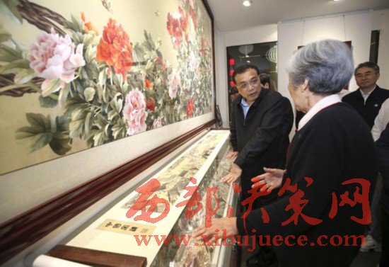李克強(qiáng)2017年5月8日晚來(lái)到開(kāi)封七盛角民俗文化街,在王素花汴繡館長(zhǎng)時(shí)間駐足。82歲的王素花多年繼承創(chuàng)新宋代傳統(tǒng)刺繡工藝,是汴繡領(lǐng)軍人物??偫碜屑?xì)觀賞后稱贊她用色“多而不雜”,技藝“爐火純青”。