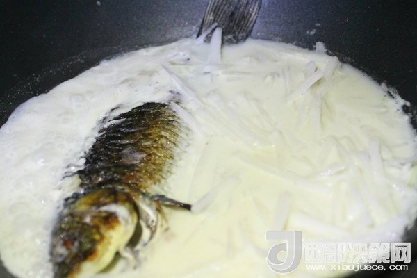 10、加入白蘿卜絲繼續(xù)中小火慢慢燉至湯汁變得更加濃稠和奶白狀態(tài)時(shí)出鍋,出鍋前5分鐘左右加入適量鹽調(diào)味,出鍋后撒上蔥花。