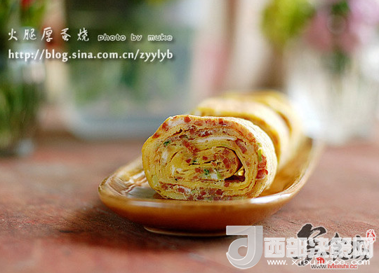 7.重復第6步驟,直到蛋液全部用完(每次倒蛋液的時候,都攪拌一下,不要讓火腿末等沉在碗底,鍋子不粘效果好的話,只需要開始時抹一次油即可,覺得粘的話,中途也可以抹油)。