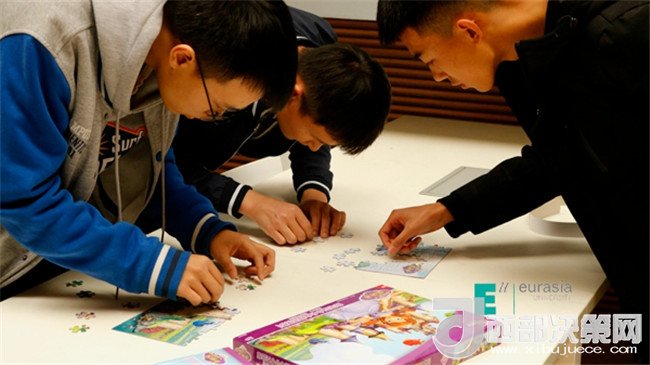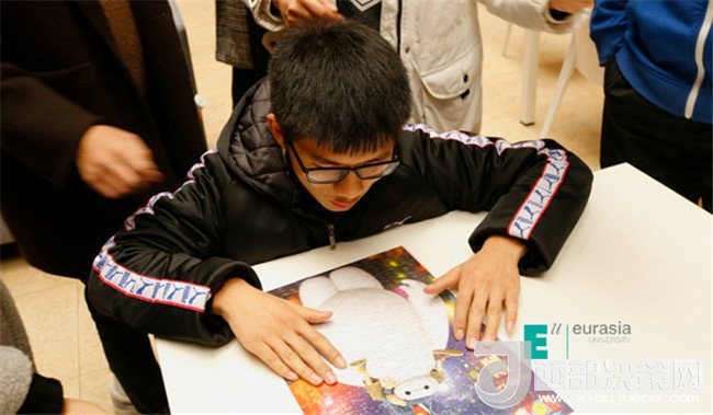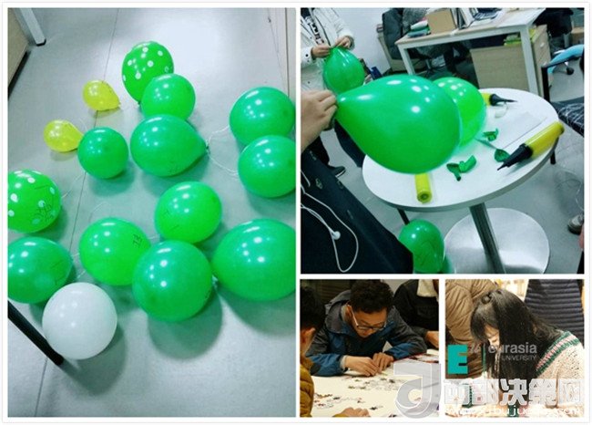 土豆和西紅柿根本就不是一個世界的,但它們走到了一起,變成了薯條和番茄醬它倆就是絕配;學籍制度和競技運動也不是一個世界的,但它們融合在了一起,變成了頭腦風暴和趣味運動它們也可以很般配,現(xiàn)在就讓我們來看看它們是怎么融合的……聽那陣陣氣球爆炸的聲音,他們開始了!在這些綠油油的氣球中有事先設置的題目隊員們要先擠爆氣球答完題才能得到下一個地方的線索,“補考成績不合格以及成績低于50分必須怎樣?”“本科選修課學分不得低于多少學分?”這些題是不是還要開動腦袋瓜仔仔細細的想想才有答案呢?在比賽的現(xiàn)場一秒都會和對手拉開差距,容不得一絲猶豫拿到線索的隊員們又奔向下一個地點熟悉的教室,這里也不是那么容易通過,看著黑板上的題“冰怎么很快的化成水?”“可替代大學英語四級成績的考試有哪些?”哦,還有計算題,隊員們必須腦洞大開,腦細胞飛速運轉,做學霸那也是不容易的。只見黑板上粉筆一起一落,答題完畢,看看線索迅速趕往下一地點——地中海。這里指壓板、跳繩早已準備好等著隊員們,學霸不能只管學習身體素質也很重要,動起來吧!在指壓板上跳繩,誰想出來的?忍受著腳底的疼痛還要揮動跳繩?太受虐,但是我們是一群不屈不撓的新一代,指壓板上跳繩我們也是鏗鏘有力、一絲不茍。終于結束痛并快樂著的跳繩環(huán)節(jié),卻看到了整整400塊的拼圖,這個環(huán)節(jié)真是讓人又愛又恨,還記得兒時玩拼圖的快樂,但在這激烈的競爭環(huán)境下,卻是讓人有點心慌和畏懼。隊員們最終齊心協(xié)力戰(zhàn)勝了它,細心、耐心的逐一完好的拼完了每一副圖。