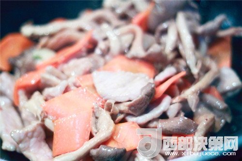 3、鍋中加入適量油,燒至6成熱后,將肉片倒鍋中大火爆炒至變色后出鍋備用。