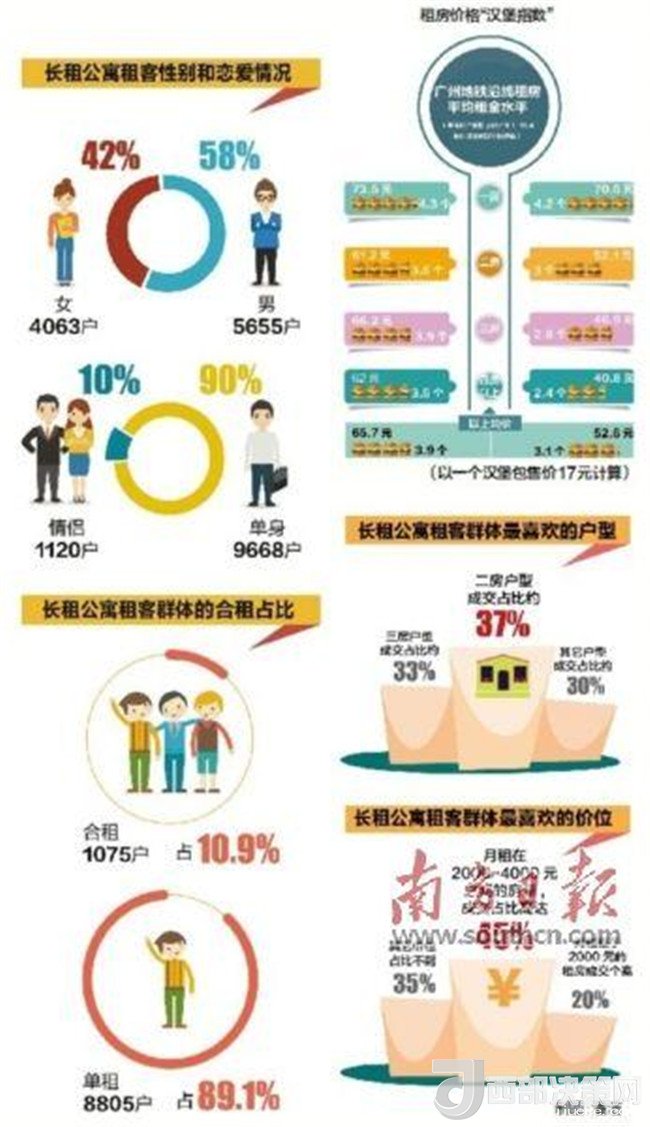 那么,對廣州這座全國主要的一線城市來說,目前的住房租賃市場和租房的情況與其他城市有何不同呢?最近,南方日報、南方+聯合萬科泊寓、廣州中原地產等企業(yè)機構,在“租房時代”南方號向廣大網友和住房租賃行業(yè)人士推出了“廣州地鐵沿線住房平均租金漢堡指數”、“長租公寓租房群體畫像”等系列大數據分析產品。