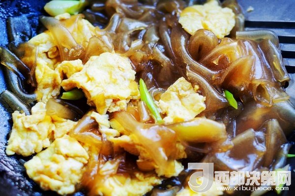等粉皮炒到油亮后倒進事先炒好的雞蛋,大火翻炒均勻入味,臨出鍋灑上香菜段或韭菜段