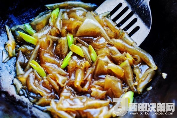 把粉皮從清水里,撈出放進炒鍋大火翻炒。