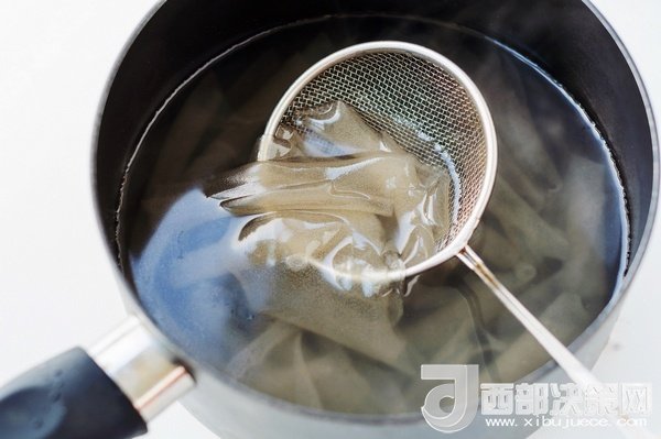 煮鍋里水燒到冒小泡時,把粉皮放進煮鍋焯燙到粉皮柔軟透明。