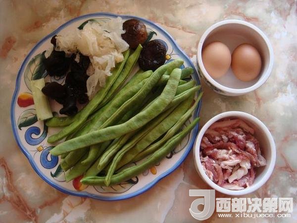 豆角:300克,大蔥:1段,木耳:4朵,香菇:4朵,銀耳:半朵,雞蛋:2個(gè),五花肉:150克,醬油:5勺,老抽:1小勺,甜面醬:3勺,鹽:7克