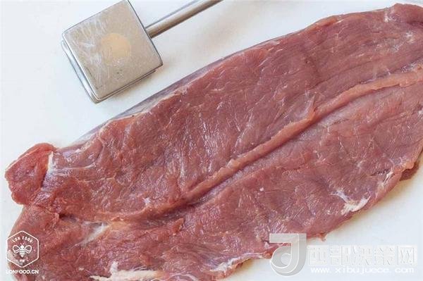 4、將農(nóng)畉豬里脊肉沿邊緣切開(kāi),像一本書(shū)一樣打開(kāi),先用保鮮膜覆蓋,再用木槌或搟面杖輕輕敲打,直到它厚度均勻;
