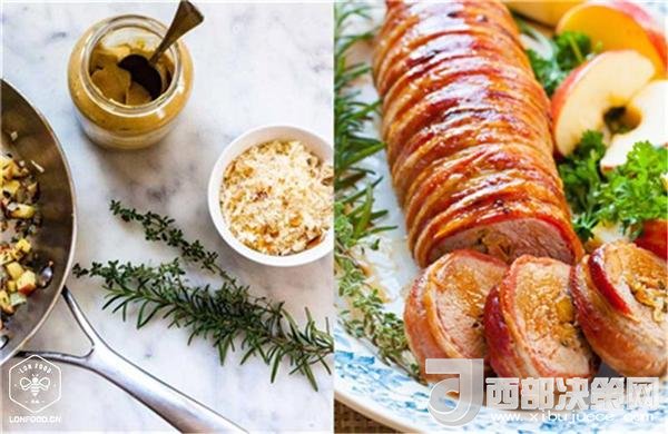 7、將烤好的夾心培根里脊卷切片,旁邊放置蘋(píng)果、迷迭香等配菜,大功告成!