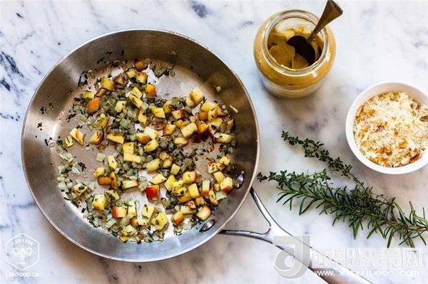 2、做餡:橄欖油鍋中加熱,加入切為碎屑的蘋(píng)果、洋蔥、迷迭香、百里香,小火煮大概10分鐘,直到它們軟化;