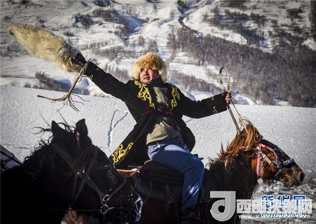 在新疆喀納斯禾木村舉辦的潑雪節(jié)上,當(dāng)?shù)鼐用裨跒橛慰捅硌菅┑氐鹧颍?月1日攝)。記者 趙戈 攝