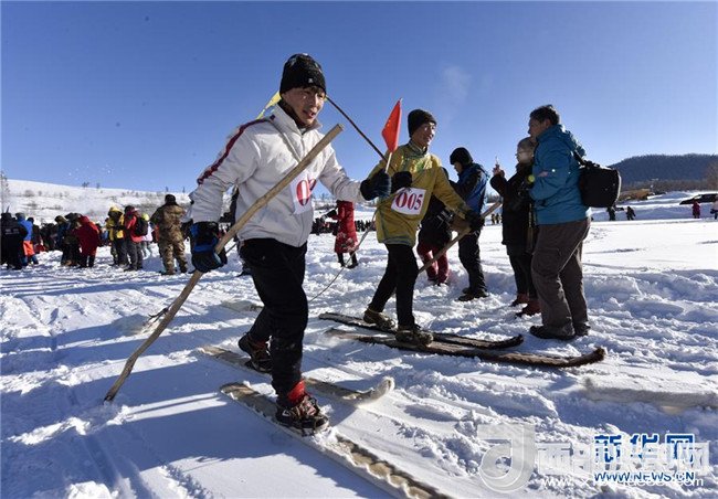 在新疆喀納斯禾木村舉辦的潑雪節(jié)上,當(dāng)?shù)鼐用衲_踩古老毛皮滑雪板,正在為游客展示原始狩獵比賽(1月1日攝)。記者 趙戈 攝