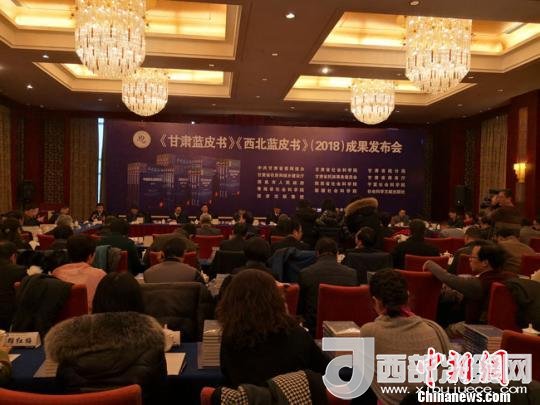 1月8日,2018年度《甘肅藍(lán)皮書》、《西北藍(lán)皮書》成果發(fā)布會(huì)在蘭州舉行。圖為發(fā)布會(huì)現(xiàn)場(chǎng)。馮志軍攝