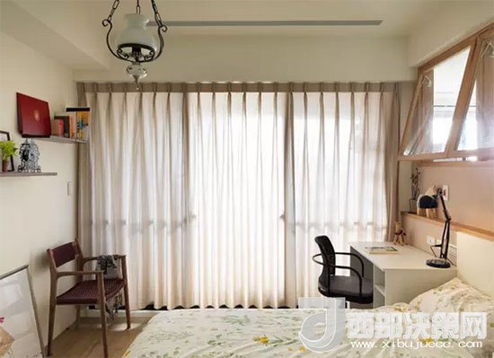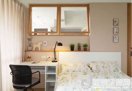 寫字臺緊靠床邊,發(fā)揮了床頭柜的功能,臺燈也可以當(dāng)做床頭燈,減少不必要的裝飾。房主人利用凹進去的墻面正好做了一個擱物臺,放上幾盆綠植,伴著自己入眠。