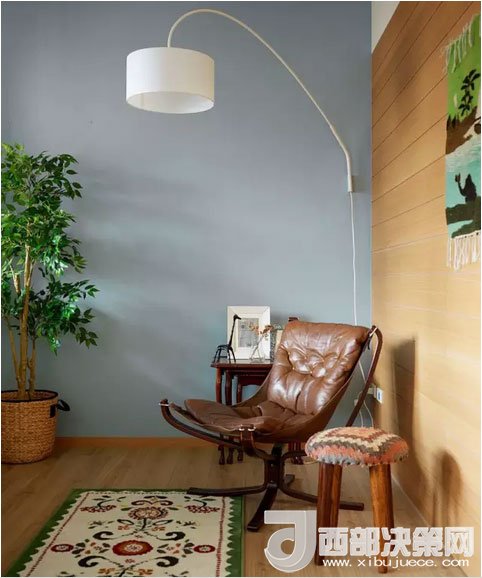 客廳的仿古沙發(fā)椅看著就很舒服。淡藍色的墻面襯托出白色釣魚燈優(yōu)美的線條。夜深燈亮,這里肯定是最溫馨的角落。