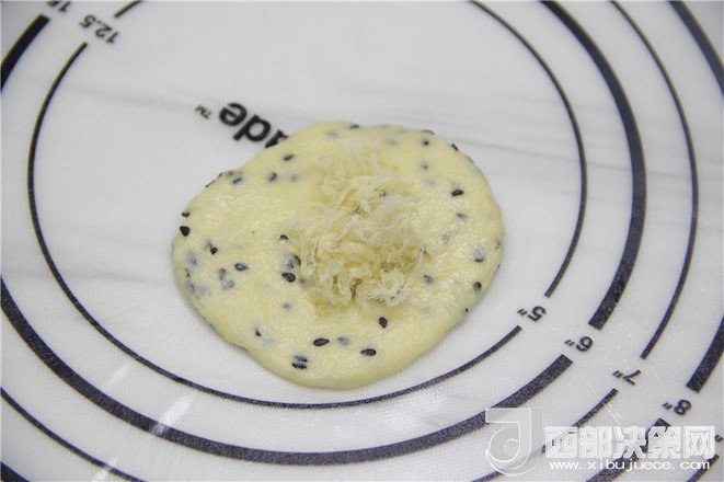 6.放入肉松,用虎口捏緊,收口朝下。