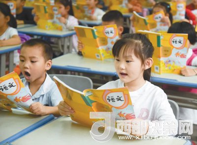2017年8月31日,安徽合肥少兒藝術(shù)學(xué)校一年級學(xué)生在開學(xué)預(yù)備課上熟悉新編語文教材。(記者張端攝)
