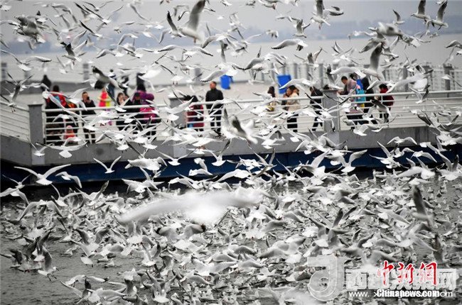 2月4日,市民穿著厚厚的冬裝在昆明滇池邊給紅嘴鷗喂食。當(dāng)日,受較強冷空氣影響,“春城”昆明最低氣溫下降至-3℃。天氣雖然寒冷,卻抵擋不住市民和游客前來滇池觀賞、喂食越冬紅嘴鷗的熱情。中新社記者李進(jìn)紅攝