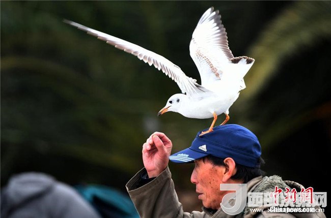 2月4日,一名市民在昆明滇池邊給飛上頭頂?shù)募t嘴鷗喂食。當(dāng)日,受較強冷空氣影響,“春城”昆明最低氣溫下降至-3℃。天氣雖然寒冷,卻抵擋不住市民和游客前來滇池觀賞、喂食越冬紅嘴鷗的熱情。中新社記者李進(jìn)紅攝