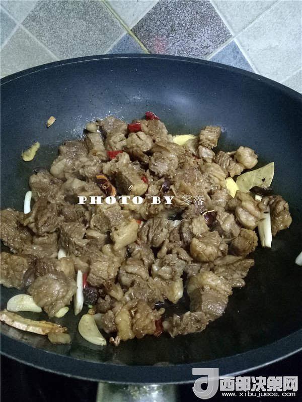6.烹入料酒,繼續(xù)翻炒;再放入姜片、蔥段、蒜瓣、干辣椒、花椒、八角、三奈、小茴香、香葉、草果炒香;