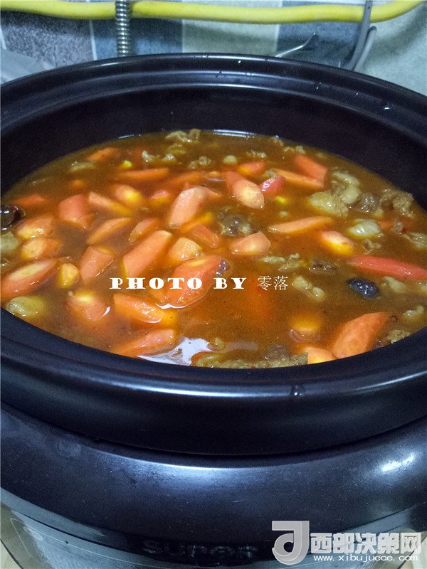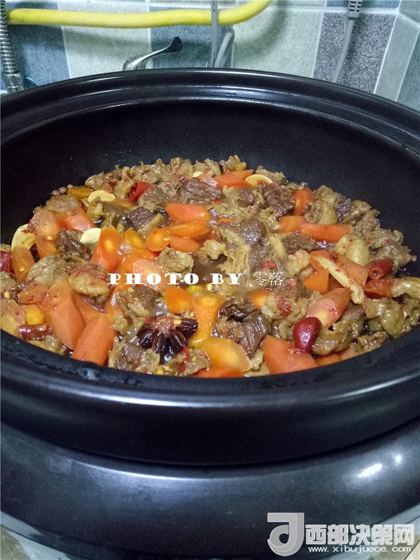 11.放入胡蘿卜;接通電源,選擇“紅燒牛羊”程序;口感選“標(biāo)準(zhǔn)”即可;