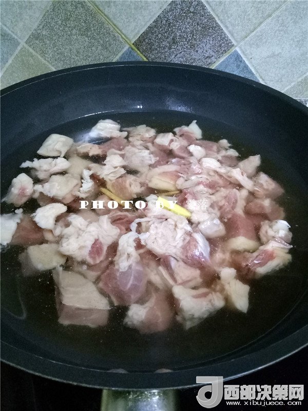 2.鍋里倒入適量清水,放入牛腩,2片姜,1顆蔥白段,適量料酒,大火燒開(kāi);