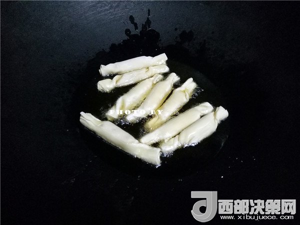 8.炒鍋里倒入稍微多一點的植物油;油鍋燒熱,轉(zhuǎn)小火;放入“糖果”炸至金黃;