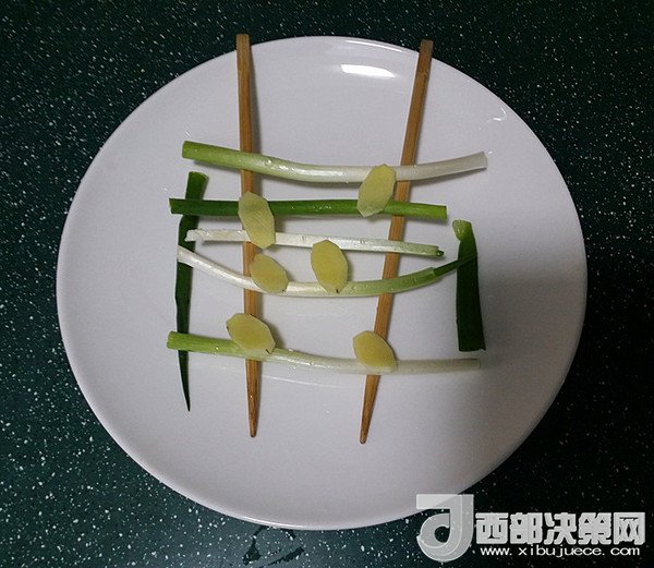 4.取一大盤子上面架起一雙筷子、放上洗凈的蔥段和姜片,也是達到去腥增香的作用