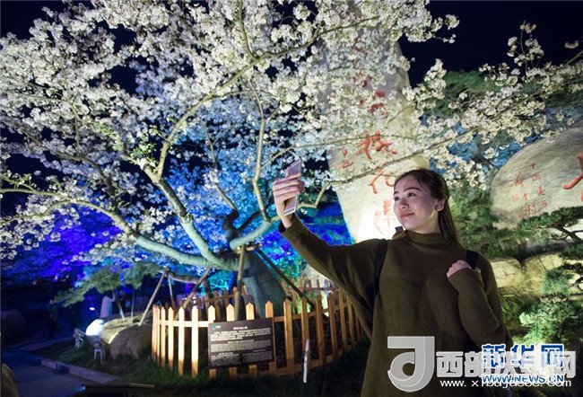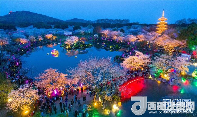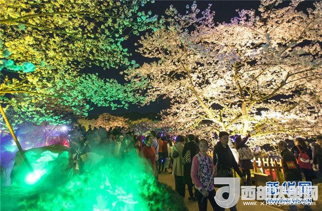 近日,武漢東湖櫻花園的櫻花競(jìng)相綻放。園區(qū)還在夜間開(kāi)啟裝飾燈光,供游客在夜色中觀(guān)賞,吸引大量游客前來(lái)踏春賞花。 新華社記者 熊琦 攝