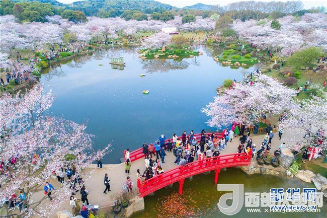 3月26日,游客在武漢東湖櫻花園內(nèi)賞花游玩。