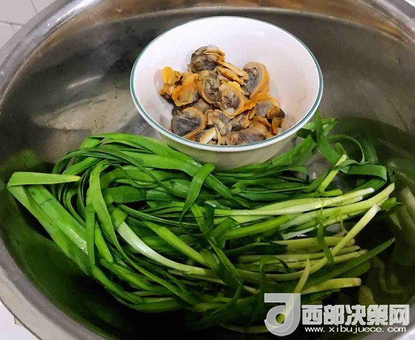 4.毛蚶肉肉取出可以用原湯汁洗凈這樣不失鮮美之味韭菜洗凈備用