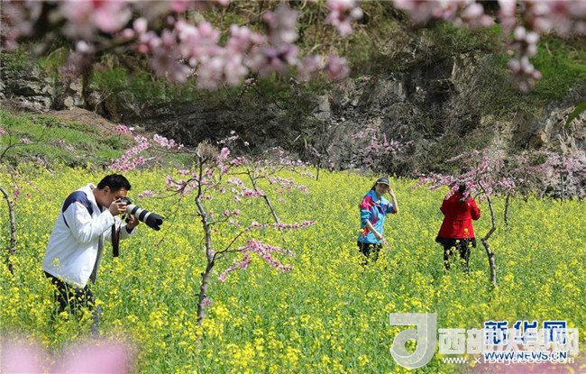 3月28日,游客在湖北省竹溪縣一處花海中游玩。(周明鑫 攝)