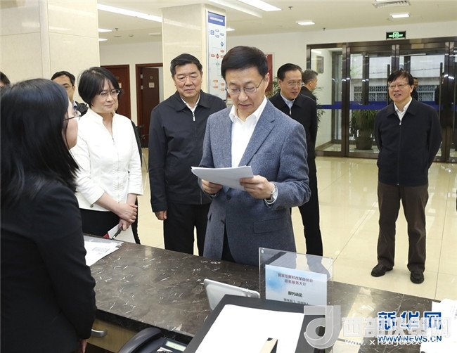 4月3日,中共中央政治局常委、國務院副總理韓正到國家發(fā)展改革委調(diào)研并主持召開座談會。這是韓正在國家發(fā)展改革委政務服務大廳考察。新華社記者 龐興雷 攝