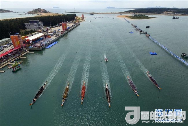 運(yùn)動(dòng)員參加在海南萬寧和樂鎮(zhèn)港北港舉行的2016中華龍舟大賽萬寧站比賽(2016年3月10日無人機(jī)拍攝)。新華社記者 楊冠宇 攝
