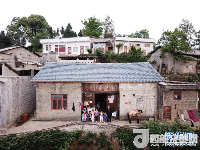 4月22日,吉雪和家人在老房子前留影(無人機拍攝)。