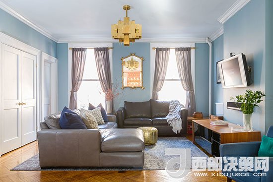 客廳的墻面全部涂刷成藍色,營造出一個雅致柔和的空間氛圍,客廳沙發(fā)選用真皮材質的款式,顯得更有復古味道。