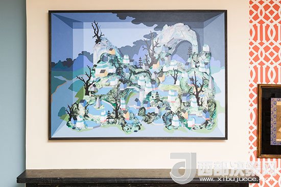 壁爐上方的墻面用掛畫來裝飾,藍色系的色彩與家居整體風格相融合,富有創(chuàng)意感的畫面讓家更有藝術氣息。
