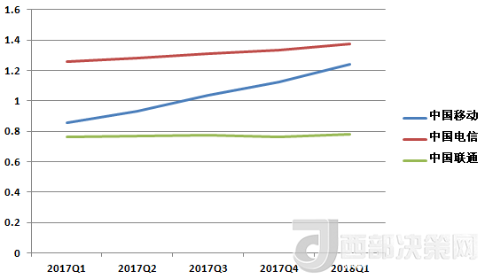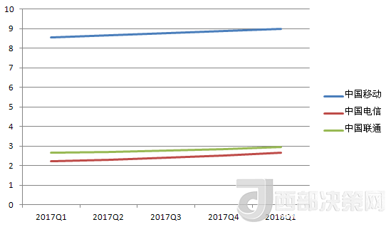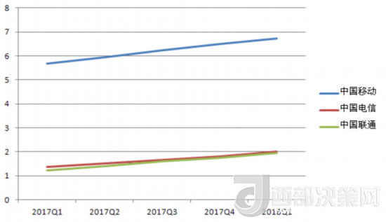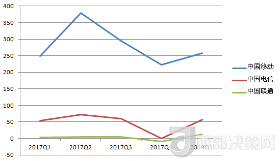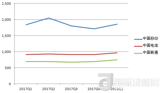 中國(guó)電信的營(yíng)收除了在2017年Q3有所下降,基本處于穩(wěn)步增長(zhǎng)趨勢(shì)。其2018年Q1的營(yíng)收數(shù)據(jù)也在三大運(yùn)營(yíng)商中排中間。