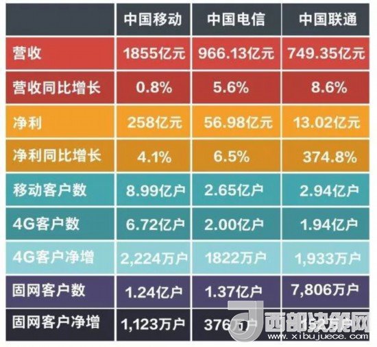 三大運(yùn)營(yíng)商在各方面皆呈增長(zhǎng)態(tài)勢(shì)。移動(dòng)的營(yíng)收、凈利雖高,但其營(yíng)收同比增長(zhǎng)率僅為0.8%。聯(lián)通的凈利潤(rùn)同比增長(zhǎng)率高達(dá)374.8%,營(yíng)收同比增幅也是最高,混改成效顯著。