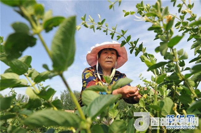 5月27日,河北省吳橋縣鐵城鎮(zhèn)雙井王村農民采摘金銀花。