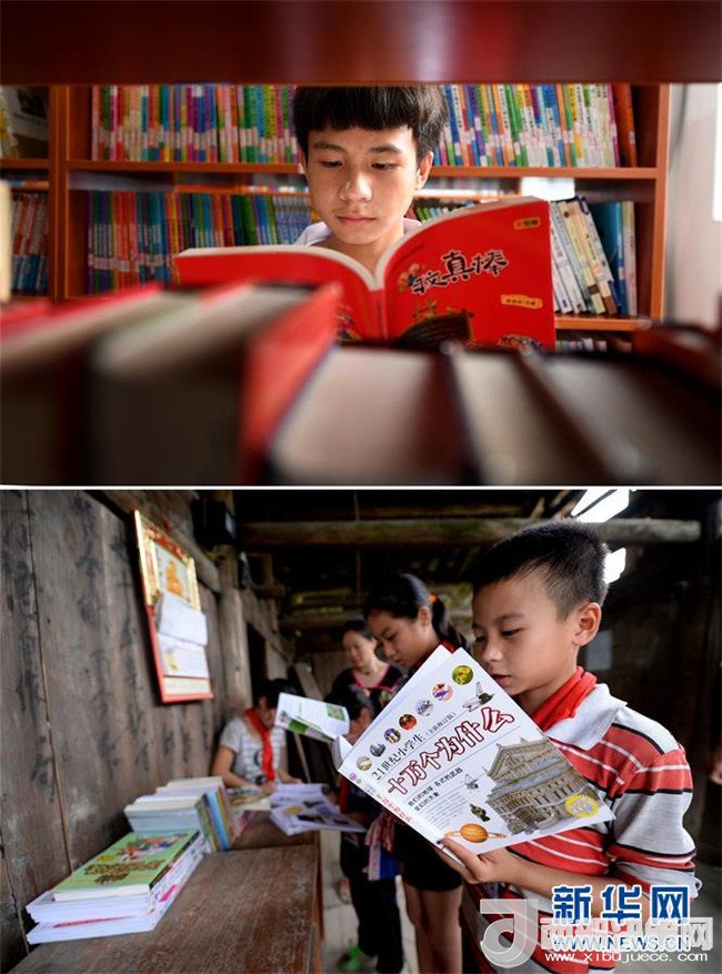 這是一張拼版圖片。上圖為2018年5月30日,在廣西三江侗族自治縣洋溪鄉(xiāng)中學(xué),15歲的秦仁金在圖書(shū)館里看書(shū);下圖為2014年6月10日,秦仁金在吊腳樓教室閱讀愛(ài)心人士送來(lái)的書(shū)本。