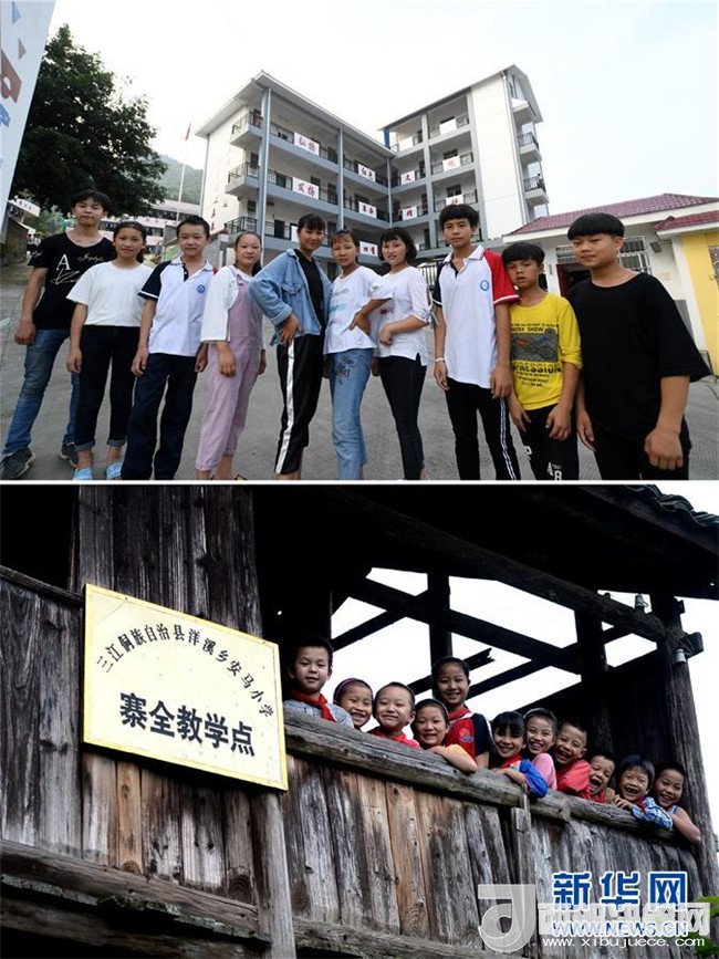 這是一張拼版圖片。上圖為2018年5月30日,在廣西三江侗族自治縣洋溪鄉(xiāng)中學(xué),已經(jīng)進(jìn)入初一就讀的孩子們?cè)谛@里合影;下圖為2014年5月26日,孩子們?cè)谡虒W(xué)點(diǎn)的吊腳樓教室上留影。