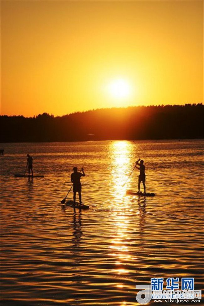 5月30日,特拉凱城堡所在的加爾韋湖上,年輕人在日落時分玩漿板沖浪。特拉凱城堡位于立陶宛首都維爾紐斯以西約25公里的加爾韋湖的一個湖心島上,始建于14世紀(jì)。新華社記者李驥志攝