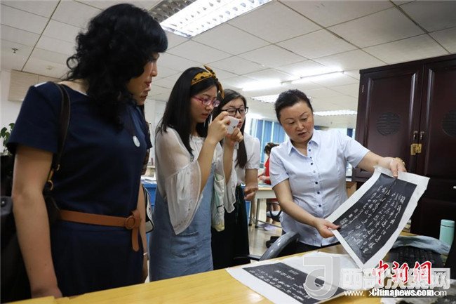 6月9日,古籍修復(fù)師王曉紅在給民眾展示拓片。中新社發(fā)瞿宏倫攝