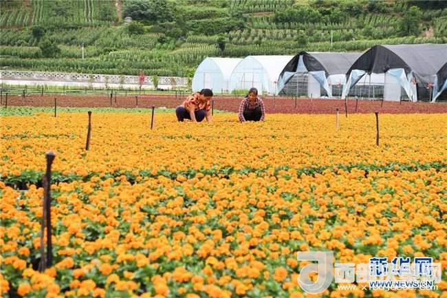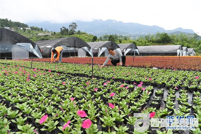 6月12日,艷山紅村村民在村里的花卉基地勞作。近年來,重慶市武隆區(qū)羊角鎮(zhèn)艷山紅村探索“公司+村集體+農戶+基地”的經營模式,發(fā)展花卉種植等產業(yè),實現(xiàn)了“農村資源變資產、資金變股金、農民變股東”,幫助當?shù)剞r民通過保底分紅、效益分紅、務工收益等方式脫貧增收。新華社記者王全超攝