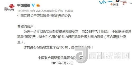 繼中國移動之后,中國聯(lián)通也于同日通過官方微博宣布:自2018年7月1日起,中國聯(lián)通取消流量“漫游”費(fèi),新老手機(jī)用戶的省內(nèi)通用流量升級為國內(nèi)流量(不含港澳臺流量)。