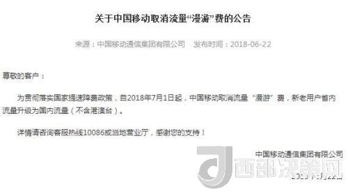 中國移動22日在官網(wǎng)發(fā)布關(guān)于取消流量“漫游”費(fèi)的公告,公告稱,自2018年7月1日起,中國移動取消流量“漫游”費(fèi),新老用戶省內(nèi)流量升級為國內(nèi)流量(不含港澳臺)。