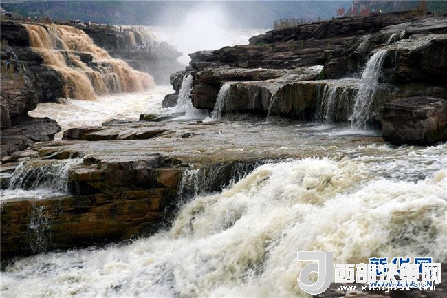近日,受上游局部地區(qū)強(qiáng)降雨影響,黃河壺口瀑布出現(xiàn)西邊濁浪翻滾、東邊白浪滔滔的奇特景觀,吸引了眾多游客前來(lái)觀看。 新華社發(fā)(呂桂明 攝)