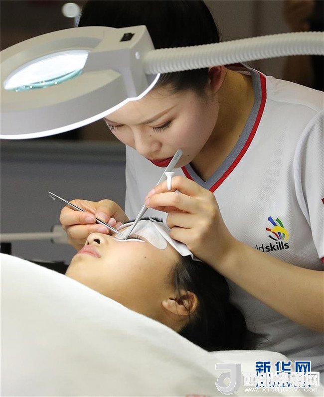 在第45屆世界技能大賽全國選拔賽上海賽區(qū)比賽中,一名美容項(xiàng)目參賽選手(上)在進(jìn)行植睫毛操作(6月13日攝)。新華社記者 方喆 攝