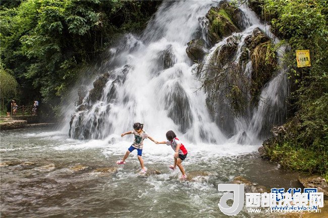 7月11日,在貴州省大方縣黃泥塘鎮(zhèn)烏溪生態(tài)農(nóng)業(yè)避暑園,小朋友在水邊戲水。